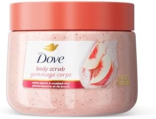 Le gommage corporel Dove à la pêche blanche et au riz concassé exfolie et nourrit en profondeur pour une peau douce et éclatante, 15 oz